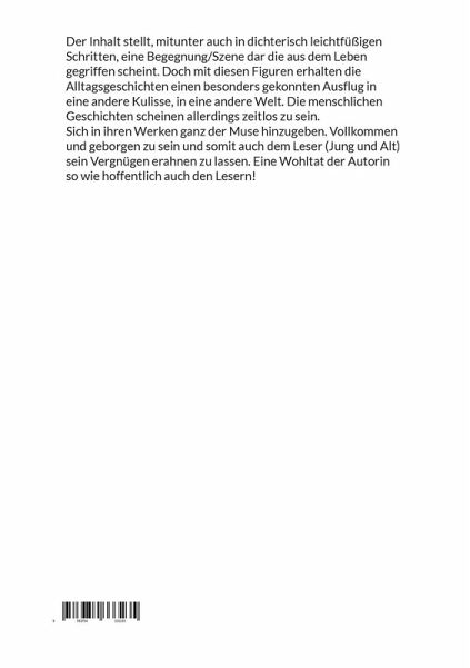 Der Inhalt stellt, mitunter auch in dichterisch leichtfüßigen Schritten, eine Begegnung/Szene dar die aus dem Leben gegriffen scheint. Doch mit diesen Figuren erhalten die Alltagsgeschichten einen besonders gekonnten Ausflug in eine andere Kulisse, in eine andere Welt. Die menschlichen Geschichten scheinen allerdings zeitlos zu sein. Sich in ihren Werken ganz der Muse hinzugeben. Vollkommen und geborgen zu sein und somit auch dem Leser (Jung und Alt) sein Vergnügen erahnen zu lassen. Eine Wohltat der Autorin so wie hoffentlich auch den Lesern!