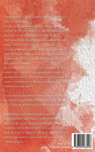 Il avait grandi ici, à Douz, porte d'entrée du Sahara, avec son grand-père. La ville avait les couleurs et la richesse de deux mondes qui se retrouvent. Les artisans-bijoutiers, tanneurs, et ferronniers voyaient passer des chameaux et des ânes encore poussiéreux de leur randonnée. Le souk y déployait son opulence de légumes et de fruits de l'oasis, alignant aussi des épices colorées, venues d'un ailleurs situé là où l'imagination n'ose plus guère s'aventurer. Mais la ville avait ses limites sur lesquelles le désert veillait. Vers le sud, la route goudronnée s'arrêtait subitement comme s'il fallait à un moment couper le cordon. Quelque chose de sauvage gagnait à nouveau les paysages. Yassir, pour la première fois de sa vie, tournait le dos au Sahara pour prendre le chemin du Nord, celui de Tunis, celui de la France, celui d'une autre existence.Mikaël Réale nous entraîne sur les pas d'un jeune migrant tunisien qui traverse la Méditerranée et débarque à Toulon, quelques jours après l'attentat du musée du Bardo. Mineur isolé, il est accueilli dans un foyer où il fait la rencontre d'Ève, la soeur de Kevin, personnage haut en couleur du son premier roman, "J'étais ailleurs".