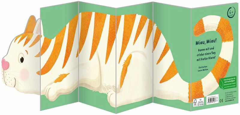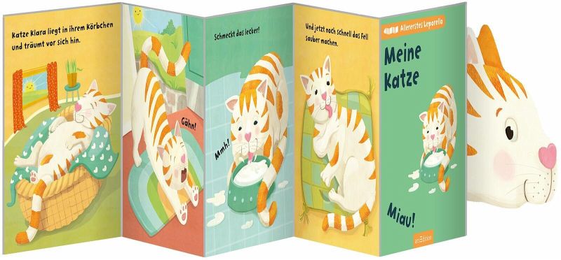 Egal ob auf dem Wickeltisch, auf der Krabbeldecke oder im Babybettchen - dieses Leporello kann überall aufgestellt werden und bietet sich somit als idealer erster Alltagsbegleiter an. Durch das handliche Format und den konturgestanzten Katzenkopf können kleine Babys schon sehr gut danach greifen und die Mini-Geschichte rund um Katze Klara wahrnehmen. Als zusätzlicher Überraschungseffekt entsteht beim Ausklappen des Buches auf dem Umschlag eine fast lebensgroße Katze. So findet das Leporello auch als modernes Dekorationsstück im Kinderzimmer seinen Platz.