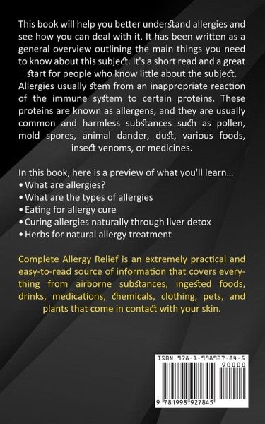 This book will help you better understand allergies and see how you can deal with it. It has been written as a general overview outlining the main things you need to know about this subject. It's a short read and a great start for people who know little about the subject. Allergies usually stem from an inappropriate reaction of the immune system to certain proteins. These proteins are known as allergens, and they are usually common and harmless substances such as pollen, mold spores, animal dander, dust, various foods, insect venoms, or medicines. In this book, here is a preview of what you'll learn...What are allergies? What are the types of allergies Eating for allergy cure Curing allergies naturally through liver detox Herbs for natural allergy treatment Complete Allergy Relief is an extremely practical and easy-to-read source of information that covers everything from airborne substances, ingested foods, drinks, medications, chemicals, clothing, pets, and plants that come in contact with your skin.
