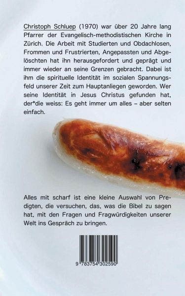 "Alles. mit scharf"ist eine kleine Sammlung von Predigten, die im Verlauf einer 20jährigen Tätigkeit als Pfarrer im Rotlichtmilieu entstanden sind. Sie geben dem biblischen Text Raum und nehmen die Fragen der Gegenwart an diesen Text ernst. So entsteht ein Gespräch zwischen Menschen und mit dem Himmel, dessen Fokus der Gegenwartsbezug ist. "Es geht immer um alles, aber nie einfach" ist die Maxime, aufgrund der die Predigten entstanden sind. Entsprechend zielen sie nicht auf ein intellektuelles Verstehen oder frommes Erschauern, sondern auf eine existentielle Auseinandersetzung mit der eigenen Spiritualität.