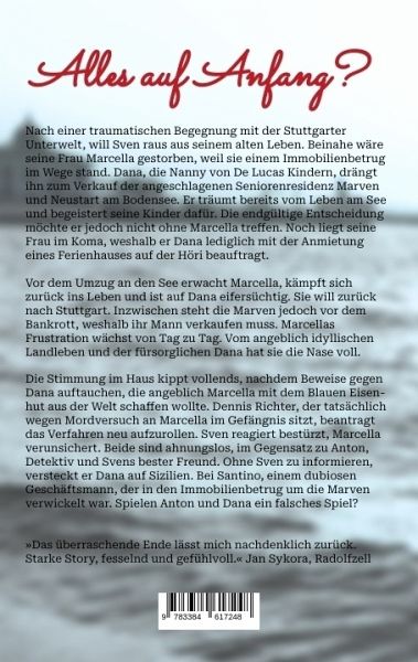 Nach einer traumatischen Begegnung mit der Stuttgarter Unterwelt, will Sven raus aus seinem alten Leben. Beinahe wäre seine Frau Marcella gestorben, weil sie einem Immobilienbetrug im Wege stand. Dana, die Nanny von De Lucas Kindern, drängt ihn zum Verkauf der angeschlagenen Seniorenresidenz Marven und Neustart am Bodensee. Er träumt bereits vom Leben am See und begeistert seine Kinder dafür. Die endgültige Entscheidung möchte er jedoch nicht ohne Marcella treffen. Noch liegt seine Frau im Koma, weshalb er Dana lediglich mit der Anmietung eines Ferienhauses auf der Höri beauftragt.Vor dem…mehr