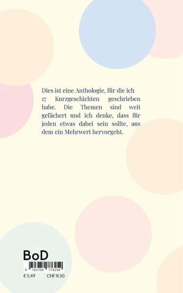 Dies ist eine Anthologie, für die ich 18 Kurzgeschichten geschrieben habe. Die Themen sind weit gefächert und ich denke, dass für jeden etwas dabei sein sollte, aus dem ein Mehrwert hervorgeht. Jetzt mit kleineren Korrekturen
