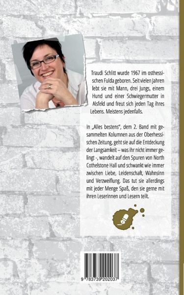 In "Alles bestens", dem 2. Band mit gesammelten Kolumnen, geht die Autorin auf Entdeckung der Langsamkeit - was ihr nicht nimmer gelingt -, wandelt auf den Spuren von North Cothelstone Hall und schwankt wie immer zwischen Liebe, Leidenschaft, Wahnsinn und Verzweiflung. Das tut sie allerdings mit jeder Menge Spaß, den sie gerne mit ihren Leserinnen und Lesern teilt.