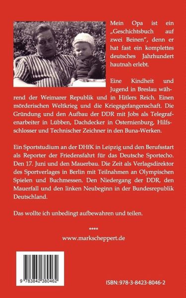 Mein Opa ist ein "Geschichtsbuch auf zwei Beinen", denn er hat fast ein komplettes deutsches Jahrhundert hautnah erlebt.Eine Kindheit und Jugend in Breslau (Schlesien) während der Weimarer Republik und in Hitlers Reich. Einen mörderischen Weltkrieg und die Kriegsgefangenschaft. Die Gründung und den Aufbau der DDR mit Jobs als Telegrafenarbeiter in Lübben, Dachdecker in Osternienburg, Hilfsschlosser und Technischer Zeichner in den Buna-Werken. Ein Sportstudium an der DHfK in Leipzig und den Berufsstart als Reporter der Friedensfahrt für das Deutsche Sportecho. Den 17. Juni und den Mauerbau. Die Zeit als Verlagsdirektor des Sportverlages in Berlin mit Teilnahmen an Olympischen Spielen und Buchmessen. Den Niedergang der DDR, den Mauerfall und den linken Neubeginn in der Bundesrepublik Deutschland. Das wollte ich unbedingt aufbewahren und teilen. www.markscheppert.de