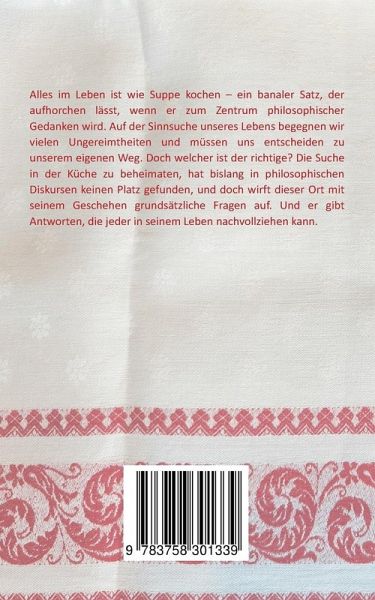 Alles im Leben ist wie Suppe kochen - ein banaler Satz, der aufhorchen lässt, wenn er zum Zentrum philosophischer Gedanken wird. Auf der Sinnsuche unseres Lebens begegnen wir vielen Ungereimtheiten und müssen uns entscheiden zu unserem eigenen Weg. Doch welcher ist der richtige? Die Suche in der Küche zu beheimaten, hat bislang in philosophischen Diskursen keinen Platz gefunden, und doch wirft dieser Ort mit seinem Geschehen grundsätzliche Fragen auf. Und er gibt Antworten, die jeder in seinem Leben nachvollziehen kann.