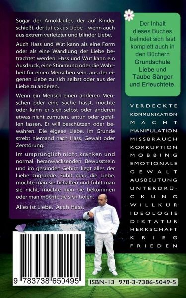 Sogar der Amokläufer, der auf Kinder schießt, der tut es aus Liebe, wenn auch aus extrem verletzter und blinder Liebe.Auch Hass und Wut kann als eine Form oder als eine Wandlung der Liebe betrachtet werden. Hass und Wut kann ein Ausdruck, eine Stimmung oder die Wahrheit für einen Menschen sein, aus der eigenen Liebe zu sich selbst oder aus der Liebe zu anderen. Wenn ein Mensch einen anderen Menschen oder eine Sache hasst, möchte oder kann er sich selbst oder anderen etwas nicht zumuten, antun oder gefallen lassen. Er will beschützen oder bewahren. Die eigene Liebe. Im Grunde strebt niemand nach Hass, Gewalt oder Zerstörung.Im ursprünglich nicht kranken und normal heranwachsenden Bewusstsein und im gesunden Gehirn liegt alles der Liebe zugrunde. Fühlt man die Liebe, möchte man sie behalten und fühlt man sie nicht, möchte man sie bekommen oder man möchte sie sich holen.Vom Menschen, seinem Denken, seiner Liebe und seinem Ursprung. Von Gott.Aus Information entsteht Logik.Aus Logik entsteht Vernunft.Aus Vernunft entsteht Liebe. Die Information ist die Liebe.