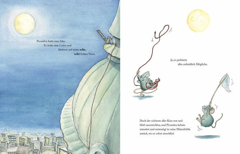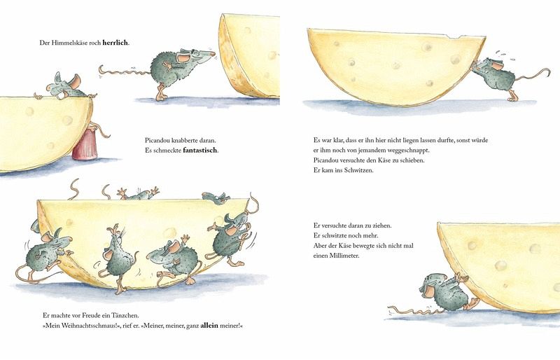 Picandou sucht für seinen Weihnachtsschmaus einen ganz besonderen Käse und versucht, von dem großen runden Käsestück, das nachts am Himmel steht, ein Stück abzuzwacken, was natürlich nicht klappt. Doch eines nachts liegt so ein Stück vor ihm auf dem Weg. Aber es ist viel zu groß und schwer, als dass er es allein in seine Höhle tragen könnte. Teilen will er aber auch nicht, der Käse ist seiner und er hat sich doch so auf ihn gefreut. So schickt er andere Nager, die bei ihm vorbeikommen und ihre Hilfe anbieten, weg. Doch irgendwann erkennt er: das geht so nicht, er muss die anderen um Hilfe fragen. Und so kommen immer mehr Mäuse und Ratten dazu und tatsächlich: gemeinsam tragen sie den Käse in Picandous Höhle und verabschieden sich wieder. Endlich kann Picandou seinen Käse probieren. Doch irgendwie schmeckt er ihm nicht mehr richtig. Er vermisst die ganze Mäusebande und ruft sie kurzerhand zurück.