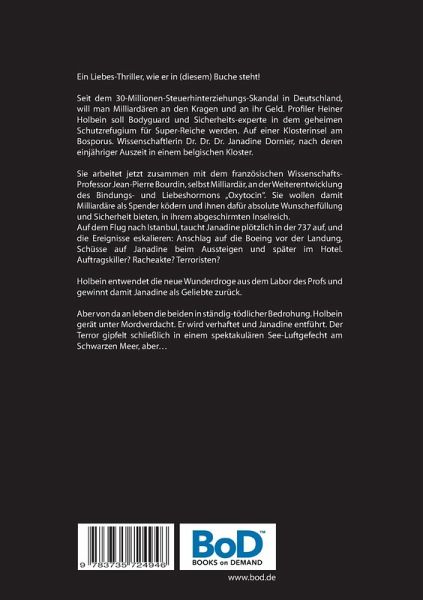 Ein Liebes-Thriller, wie er in (diesem) Buche steht!Seit dem 30-Millionen-Steuerhinterziehungs-Skandal in Deutschland, will man Milliardären an den Kragen und an ihr Geld. Profiler Heiner Holbein soll Bodyguard und Sicherheitsexperte in dem geheimen Schutzrefugium für Super-Reiche werden. Auf einer Klosterinsel am Bosporus. Wissenschaftlerin Dr. Dr. Dr. Janadine Dornier, nach deren einjähriger Auszeit in einem belgischen Kloster. Sie arbeitet jetzt zusammen mit dem französischen Wissenschafts-Professor Jean-Pierre Bourdin, selbst Milliardär, an der Weiterentwicklung des Bindungs- und Liebeshormons "Oxytocin". Sie wollen damit Milliardäre als Spender ködern und ihnen dafür absolute Wunscherfüllung und Sicherheit bieten, in ihrem abgeschirmten Inselreich. Auf dem Flug nach Istanbul, taucht Janadine plötzlich in der 737 auf, und die Ereignisse eskalieren: Anschlag auf die Boeing vor der Landung, Schüsse auf Janadine beim Aussteigen und später im Hotel. Auftragskiller? Racheakte? Terroristen?Holbein entwendet die neue Wunderdroge aus dem Labor des Profs und gewinnt damit Janadine als Geliebte zurück. Aber von da an leben die beiden in ständig-tödlicher Bedrohung. Holbein gerät unter Mordverdacht. Er wird verhaftet und Janadine entführt. Der Terror gipfelt schließlich in einem spektakulären See-Luftgefecht am Schwarzen Meer, aber...