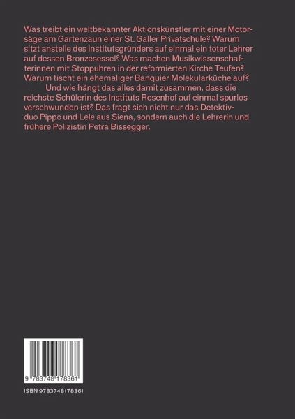 Was treibt ein weltbekannter Aktionskünstler mit einer Motorsäge am Gartenzaun einer St.Galler Privatschule? Warum sitzt anstelle des Institutsgründers auf einmal ein toter Lehrer auf dessen Bronzesessel? Was machen Musikwissenschafterinnen mit Stoppuhren in der reformierten Kirche Teufen? Warum tischt ein ehemaliger Banquier Molekularküche auf?Und wie hängt das alles damit zusammen, dass die reichste Schülerin des Instituts Rosenhof auf einmal spurlos verschwunden ist? Das fragt sich nicht nur das Detektivduo Pippo und Lele aus Siena, sondern auch die Lehrerin und frühere Polizistin Petra Bissegger.