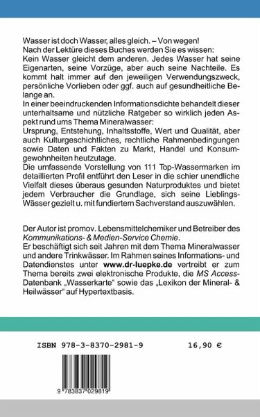 Kein Mineralwasser gleicht dem anderen. Jedes Wasser hat seine Eigenarten, seine Vorzüge, aber auch seine Nachteile. Es kommt halt immer auf den jeweiligen Verwendungszweck, auf persönliche Vorlieben oder ggf. auch auf gesundheitliche Belange an.In einer beeindruckenden Informationsdichte behandelt dieser unterhaltsame und nützliche Ratgeber so wirklich jeden Aspekt rund ums Thema Mineralwasser:Ursprung, Entstehung, Inhaltsstoffe, Wert und Qualität, aber auch Kulturgeschichtliches, rechtliche Rahmenbedingungen sowie Daten und Fakten zu Markt, Handel und Konsumgewohnheiten heutzutage.Eine umfassende und detaillierte Vorstellung von 111 Top-Wassermarken des Handels gibt jedem interessierten Verbraucher einen einmaligen Einblick in die Vielfalt dieses überaus gesunden Naturproduktes und eine Richtschnur zur gezielten und verlässlichen Auswahl seiner Lieblings-Wässer.