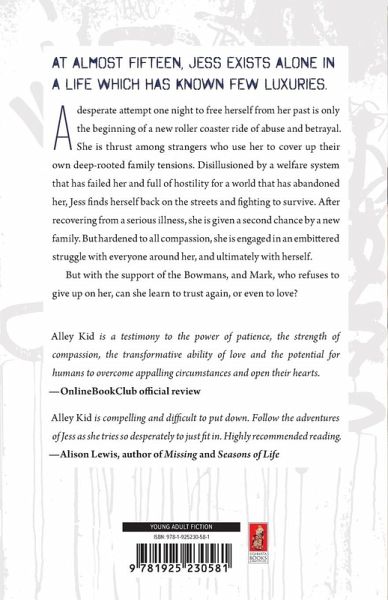 At almost fifteen, Jess exists alone in a life which has known few luxuries. A desperate attempt one night to free herself from her past is only the beginning of a new roller coaster ride of abuse and betrayal. She is thrust among strangers who use her to cover up their own deep-rooted family tensions. Disillusioned by a welfare system that has failed her and full of hostility for a world that has abandoned her, Jess finds herself back on the streets and fighting to survive. After recovering from a serious illness, she is given a second chance by a new family. But hardened to all compassion, she is engaged in an embittered struggle with everyone around her, and ultimately with herself. But with the support of the Bowmans, and Mark, who refuses to give up on her, can she learn to trust again, or even to love?