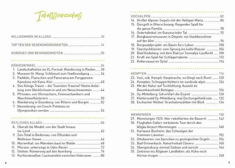 Trendiger Freizeitsport, Kuhglockenromantik und Hi-Tech, einsames Gipfelglück und lebendige Städte - verpackt in traumhafte Landschaften: das Allgäu, in weiten Teilen Kulturland, von Leuten geschaffen, die stolz darauf sind, hier naturnah zu leben, die Traditionen pflegen und zugleich offen sind für Gäste und neue Ideen. Südseekapitän zu werden, etwa. Während einer Bootsfahrt auf dem Bodensee hatte Karl Nauer diesen Traum. Wer weiß, was Ihnen in den Sinn kommt, während Sie um die Inselstadt Lindau paddeln? Finden Sie's heraus. Zimmern Sie sich aus über 50 Tipps Ihre ganz persönliche Abenteuerreise zusammen - als Tagestrip, Wochenendausflug oder Urlaub. Die Triptipps sind mit Leichtigkeit erzählt, und vereinen Lesespaß und nützliche Informationen. Ihre Reise beginnt nicht mit dem ersten Schritt, sondern auf der ersten Seite dieses Buches. Jetzt sind Sie dran: Lassen Sie sich inspirieren und entdecken Sie neue Seiten einer großartigen Region - Seite für Seite, Moment für Moment!