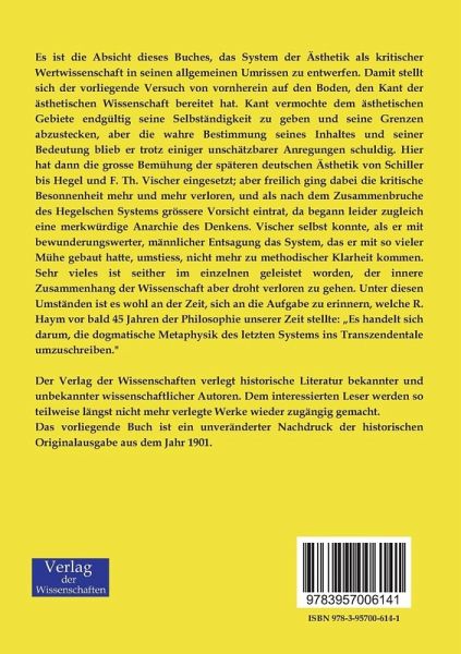 Es ist die Absicht dieses Buches, das System der Ästhetik als kritischer Wertwissenschaft in seinen allgemeinen Umrissen zu entwerfen. Damit stellt sich der vorliegende Versuch von vornherein auf den Boden, den Kant der ästhetischen Wissenschaft bereitet hat. Kant vermochte dem ästhetischen Gebiete endgültig seine Selbständigkeit zu geben und seine Grenzen abzustecken, aber die wahre Bestimmung seines Inhaltes und seiner Bedeutung blieb er trotz einiger unschätzbarer Anregungen schuldig. Hier hat dann die grosse Bemühung der späteren deutschen Ästhetik von Schiller bis Hegel und F. Th. Vischer eingesetzt; aber freilich ging dabei die kritische Besonnenheit mehr und mehr verloren, und als nach dem Zusammenbruche des Hegelschen Systems grössere Vorsicht eintrat, da begann leider zugleich eine merkwürdige Anarchie des Denkens. Vischer selbst konnte, als er mit bewunderungswerter, männlicher Entsagung das System, das er mit so vieler Mühe gebaut hatte, umstiess, nicht mehr zu methodischer Klarheit kommen. Sehr vieles ist seither im einzelnen geleistet worden, der innere Zusammenhang der Wissenschaft aber droht verloren zu gehen. Unter diesen Umständen ist es wohl an der Zeit, sich an die Aufgabe zu erinnern, welche R. Haym vor bald 45 Jahren der Philosophie unserer Zeit stellte: "Es handelt sich darum, die dogmatische Metaphysik des letzten Systems ins Transzendentale umzuschreiben."