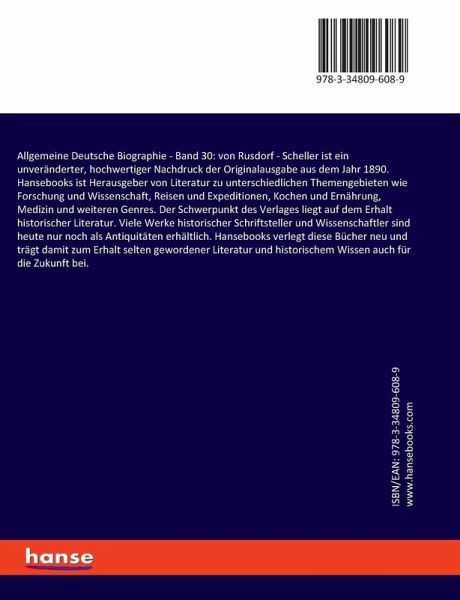 Allgemeine Deutsche Biographie - Band 30: von Rusdorf - Scheller ist ein unveränderter, hochwertiger Nachdruck der Originalausgabe aus dem Jahr 1890.Hansebooks ist Herausgeber von Literatur zu unterschiedlichen Themengebieten wie Forschung und Wissenschaft, Reisen und Expeditionen, Kochen und Ernährung, Medizin und weiteren Genres. Der Schwerpunkt des Verlages liegt auf dem Erhalt historischer Literatur. Viele Werke historischer Schriftsteller und Wissenschaftler sind heute nur noch als Antiquitäten erhältlich. Hansebooks verlegt diese Bücher neu und trägt damit zum Erhalt selten gewordener Literatur und historischem Wissen auch für die Zukunft bei.