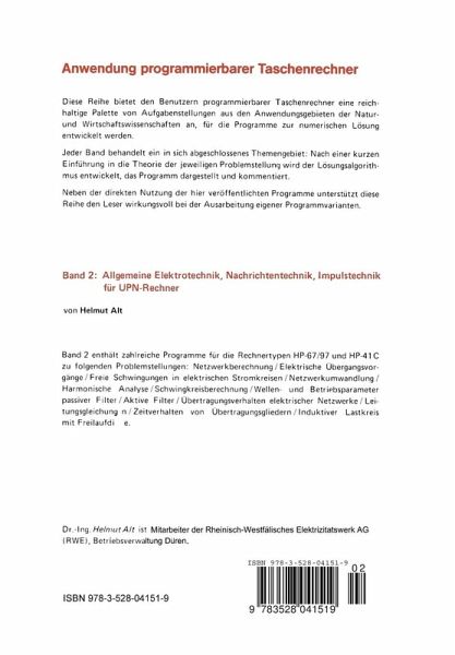 Die mit Band 1 begonnene Reihe Anwendung programmierbarer Taschenrechner wird mit dem vorliegenden Band 2 zu den Fachgebieten Allgemeine Elektrotechnik, Nachrichtentechnik und Impulstechnik fortgesetzt. Dieser Band wendet sich insbesondere an Ingenieure der Elektrotechnik aus Entwicklungs-, Labor und Betriebsbereichen, die an einer rationellen und systematischen Bearbeitung sich wiederholender AufgabensteIlungen aus den genannten Fachgebieten interessiert sind. Studenten an Technischen Hochschulen und Fachhochschulen erhalten einen Einblick in die Möglichkeiten und Grenzen der Anwendung programmierbarer Taschenrechner. Dem Leser wird ein Nachschlagefundus mit Beispielen für programmierte Aufgabenlösungen prak tischer Anwendungsfälle in die Hand gegeben. Die hierbei gegebenen Programmierhinweise haben den Zweck, die Ausarbeitung spezieller, auf die eigene Problemstellung zugeschnittene Programme zu erleichtern. Zu den AufgabensteIlungen werden die mathematischen Grundlagen nur soweit dargestellt, wie es zur Programmierung des Lösungsalgorithmus erforderlich ist. Zum tieferen Eindringen in die jewei lige Thematik wird auf die vorhandene Fachliteratur verwiesen. Die angegebenen Programme sind auf die UPN-Technik HP-67 und HP-97 mit externem Magnet karten-Speicher zugeschnitten. Mit Hilfe der angegebenen Lösungsgleichungen und den Hinweisen zu der jeweiligen Programmstruktur sind die Programme jedoch auch auf andere Rechnersysteme übertragbar. Der Verfasser geht davon aus, daß die den Rechnern aller Systeme zugehörigen Be dienungshandbücher und die hierzu vorliegende Sekundärliteratur alle Fragen zur eigentlichen Be dienung und praktischen Einübung umfassend beantworten. Der vorliegende Band soll als Lehr-und Arbeitsbuch eine Brücke zwischen den objektiven Möglich keiten der Technik (Hardware) und den subjektiven Fähigkeiten zu einer rechnergerechten Problem analyse und rationellen Problemlösung (Software) bauen.