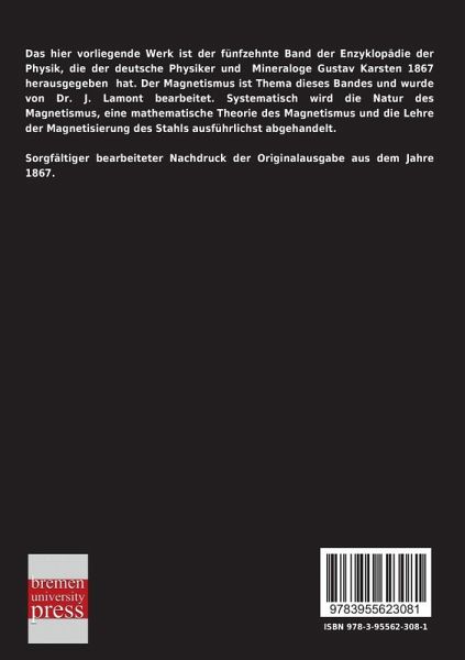 Das hier vorliegende Werk ist der fünfzehnte Band der Enzyklopädie der Physik, die der deutsche Physiker und Mineraloge Gustav Karsten 1867 herausgegeben hat. Der Magnetismus ist Thema dieses Bandes und wurde von Dr. J. Lamont bearbeitet. Systematisch wird die Natur des Magnetismus, eine mathematische Theorie des Magnetismus und die Lehre der Magnetisierung des Stahls ausführlichst abgehandelt.