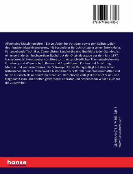 Allgemeine Maschinenlehre - Ein Leitfaden für Vorträge, sowie zum Selbststudium des heutigen Maschinenwesens, mit besonderer Berücksichtigung seiner Entwicklung. Für angehende Techniker, Cameralisten, Landwirthe und Gebildete jeden Standes. ist ein unveränderter, hochwertiger Nachdruck der Originalausgabe aus dem Jahr 1877.