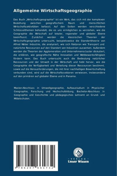 Das Buch "Wirtschaftsgeographie" ist ein Werk, das sich mit der komplexen Beziehung zwischen geografischem Raum und menschlichen Wirtschaftsaktivitäten befasst. Auf den Seiten werden verschiedene Schlüsselthemen behandelt, die es uns ermöglichen zu verstehen, wie die Geographie die Wirtschaft auf lokaler, regionaler und globaler Ebene beeinflusst. Zunächst werden die klassischen Theorien der Wirtschaftsgeographie untersucht, beispielsweise die Standorttheorie von Alfred Weber Industrie, die analysiert, wie sich Faktoren wie Transport und natürliche Ressourcen auf den Standort von Industrien auswirken. Außerdem werden die Theorien der Agglomeration und Unternehmenscluster diskutiert, die erklären, wie geografische Nähe Innovation und Wettbewerbsfähigkeit fördern kann. Das Buch untersucht auch die Bedeutung natürlicher Ressourcen und der Umwelt in der Wirtschaft und hebt hervor, wie die Geographie die Verfügbarkeit und Verteilung dieser Ressourcen bestimmt. sowie auf die Herausforderungen, die mit ihrer nachhaltigen Bewirtschaftung verbunden sind, wird auf die Wirtschaftssektoren verwiesen, insbesondere auf den primären auf globaler Ebene und in Panama.