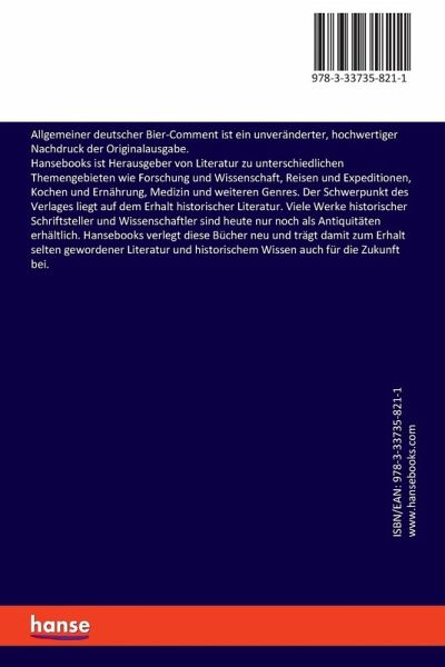 Allgemeiner deutscher Bier-Comment ist ein unveränderter, hochwertiger Nachdruck der Originalausgabe.Hansebooks ist Herausgeber von Literatur zu unterschiedlichen Themengebieten wie Forschung und Wissenschaft, Reisen und Expeditionen, Kochen und Ernährung, Medizin und weiteren Genres. Der Schwerpunkt des Verlages liegt auf dem Erhalt historischer Literatur. Viele Werke historischer Schriftsteller und Wissenschaftler sind heute nur noch als Antiquitäten erhältlich. Hansebooks verlegt diese Bücher neu und trägt damit zum Erhalt selten gewordener Literatur und historischem Wissen auch für die Zukunft bei.