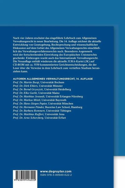 Nach vier Jahren erscheint das eingeführte Lehrbuch in neuer Bearbeitung. Die 14. Auflage zeichnet die aktuelle Entwicklung von Gesetzgebung, Rechtsprechung und wissenschaftlicher Diskussion auf dem Gebiet des Allgemeinen Verwaltungsrechts einschließlich des Verwaltungsverfahrensrechts nach. Besonderes Augenmerk wird der fortschreitenden Einwirkung des Europäischen Gemeinschaftsrechts geschenkt. Einbezogen wurde auch das Internationale Verwaltungsrecht. Die Neuauflage enthält die JURA-Kartei (JK) auf CD-ROM mit ca. 5550 kommentierten Gerichtsentscheidungen, die der Leser über die Verweise in dem Lehrbuch zum vertieften Studium heranziehen kann.