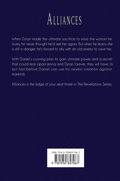 When Dylan made the ultimate sacrifice to save the woman he loves, he never thought he’d see her again. But when he learns she is still in danger, he’s forced to ally with an old enemy to save her. With Daniel’s cunning plan to gain ultimate power and a secret that could tear apart Dylan and Jenna forever, they will have to act fast before Daniel can use his newest creation against mankind. Alliances is the edge of your seat finale in The Revelations Series