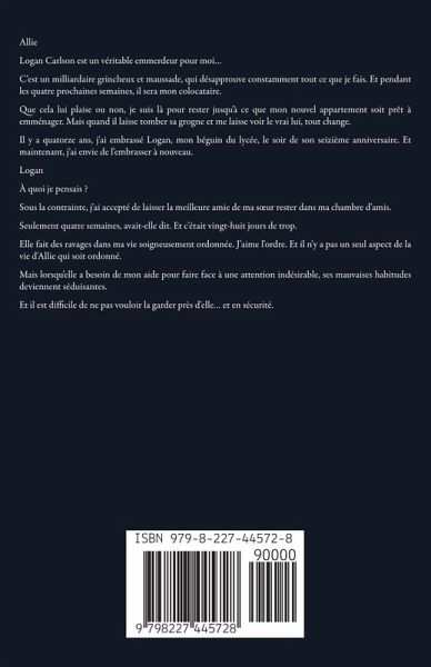 Allie Logan Carlson est un véritable emmerdeur pour moi... C'est un milliardaire grincheux et maussade, qui désapprouve constamment tout ce que je fais. Et pendant les quatre prochaines semaines, il sera mon colocataire. Que cela lui plaise ou non, je suis là pour rester jusqu'à ce que mon nouvel appartement soit prêt à emménager. Mais quand il laisse tomber sa grogne et me laisse voir le vrai lui, tout change. Il y a quatorze ans, j'ai embrassé Logan, mon béguin du lycée, le soir de son seizième anniversaire. Et maintenant, j'ai envie de l'embrasser à nouveau. Logan À quoi je pensais ? Sous la contrainte, j'ai accepté de laisser la meilleure amie de ma s¿ur rester dans ma chambre d'amis. Seulement quatre semaines, avait-elle dit. Et c'était vingt-huit jours de trop. Elle fait des ravages dans ma vie soigneusement ordonnée. J'aime l'ordre. Et il n'y a pas un seul aspect de la vie d'Allie qui soit ordonné. Mais lorsqu'elle a besoin de mon aide pour faire face à une attention indésirable, ses mauvaises habitudes deviennent séduisantes. Et il est difficile de ne pas vouloir la garder près d'elle... et en sécurité.