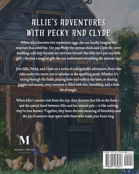 When Allie discovers two mysterious eggs, she can hardly imagine the surprises that await her. Out pop Pecky the curious chick and Clyde the clever duckling, and they become her new best friends! But Allie isn't just any little girl-she has a magical gift: she can understand everything the animals say! Join Allie, Pecky, and Clyde on a series of unforgettable adventures, from bike rides under the warm sun to splashes in the sparkling pond. Whether it's racing through the fields, playing hide-and-seek in the barn, or sharing giggles and secrets, every moment is filled with fun, friendship, and a little bit of magic. When Allie's cousins visit from the city, they discover that life on the farm-and the special bond between Allie and her animal pals-is like nothing they've ever known. Together, they learn the true meaning of friendship and the joy of summer days spent with those who make your heart sing. Perfect for young readers, this charming and beautifully illustrated tale is a celebration of imagination, adventure, and the special magic that only the best of friends can bring. Get ready to join Allie, Pecky, and Clyde for a summer you'll never forget!