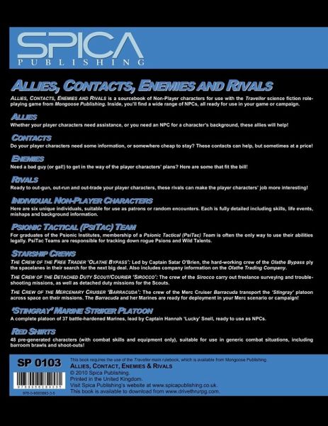 Allies, Contacts, Enemies and Rivals continues Spica Publishing's fine tradition of producing high-quality supplementary material for the Traveller RPG, presenting over 60 fully detailed NPCs to help and hinder your players, a PsiTac team, individual Patrons, complete Free Trader, Scout/Courier, and Mercenary Cruiser starship crews and a marine striker platoon! Also included are 48 quick NPC statblocks to use as 'redshirts' in combat situations. Requires the Traveller core rulebook, available from Mongoose Publishing.
