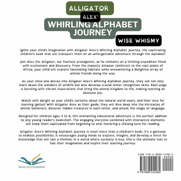 Ignite your child's imagination with Alligator Alex's Whirling Alphabet Journey, the captivating children's book that will transport them on an unforgettable adventure through the alphabet! Join Alex the Alligator, our fearless protagonist, as he embarks on a thrilling expedition filled with excitement and discovery. From the majestic Amazon rainforest to the vast plains of Africa, your child will explore fascinating habitats while encountering a delightful array of animal friends along the way. As your little one delves into Alligator Alex's Whirling Alphabet Journey, they will not only learn about the wonders of wildlife but also develop crucial letter recognition skills. Each page is bursting with vibrant illustrations that bring the animal kingdom to life, making learning an absolute joy. Watch with delight as your child's curiosity about the natural world soars, and their love for learning ignites! With Alligator Alex as their guide, they will dive deep into the intricacies of animal behaviors, discover hidden treasures in each letter, and unlock the magic of language. Designed for children ages 4 to 8, this enchanting educational adventure is the perfect addition to any young reader's bookshelf. The engaging storyline combined with interactive elements will keep them captivated from beginning to end, fostering a lifelong love for reading. Alligator Alex's Whirling Alphabet Journey is much more than a children's book; it's a gateway to endless possibilities. It encourages young minds to explore, imagine, and develop a thirst for knowledge that will last a lifetime. In a world where curiosity is key, this is the ultimate tool to fuel their imagination and inspire their learning journey. Don't miss out on this remarkable book that will transport your child to a world of adventure and knowledge. Order your copy of Alligator Alex's Whirling Alphabet Journey today and watch them embark on an unforgettable educational experience that they'll cherish forever!