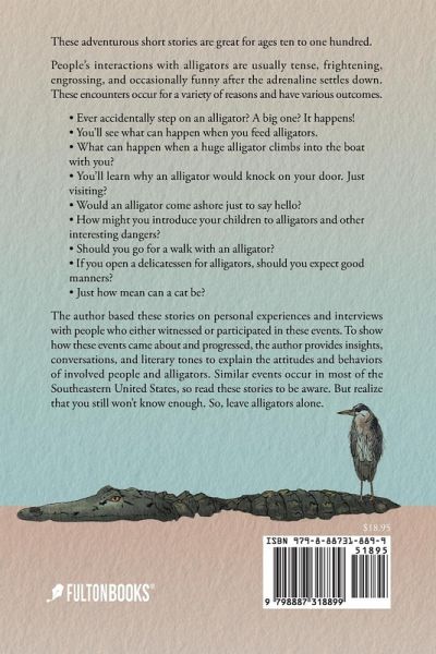 These adventurous short stories are great for ages ten to one hundred. People's interactions with alligators are usually tense, frightening, engrossing, and occasionally funny after the adrenaline settles down. These encounters occur for a variety of reasons and have various outcomes. Ever accidentally step on an alligator? A big one? It happens! You'll see what can happen when you feed alligators. What can happen when a huge alligator climbs into the boat with you? You'll learn why an alligator would knock on your door. Just visiting? Would an alligator come ashore just to say hello? How might you introduce your children to alligators and other interesting dangers? Should you go for a walk with an alligator? If you open a delicatessen for alligators, should you expect good manners? Just how mean can a cat be? The author based these stories on personal experiences and interviews with people who either witnessed or participated in these events. To show how these events came about and progressed, the author provides insights, conversations, and literary tones to explain the attitudes and behaviors of involved people and alligators. Similar events occur in most of the Southeastern United States, so read these stories to be aware. But realize that you still won't know enough. So, leave alligators alone.