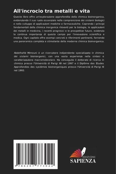 Questo libro offre un'esplorazione approfondita della chimica bioinorganica, evidenziando il suo ruolo essenziale nella comprensione dei sistemi biologici e nello sviluppo di applicazioni mediche e farmaceutiche. Coprendo i principi fondamentali della chimica inorganica rilevanti per la biologia, le applicazioni dei metalli in medicina, i recenti progressi e le prospettive future, evidenzia la continua importanza di questo campo per l'innovazione scientifica e medica. Ogni capitolo offre esempi concreti e riferimenti pertinenti, fornendo una panoramica completa e stimolante della moderna chimica bioinorganica.
