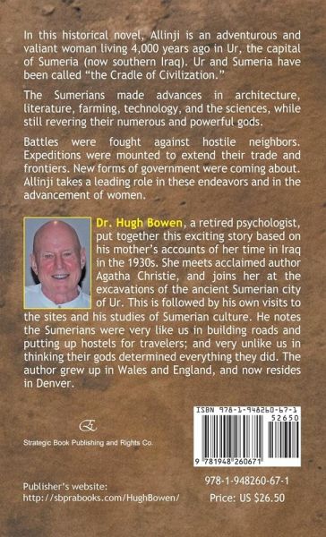 In this historical novel, Allinji is an adventurous and valiant woman living 4,000 years ago in Ur, the capital of Sumeria (now southern Iraq). Ur and Sumeria have been called "the Cradle of Civilization." The Sumerians made advances in architecture, literature, farming, technology, and the sciences, while still revering their numerous and powerful gods. Battles were fought against hostile neighbors. Expeditions were mounted to extend their trade and frontiers. New forms of government were coming about. Allinji takes a leading role in these endeavors and in the advancement of women. Dr. Hugh Bowen, a retired psychologist, put together this exciting story based on his mother's accounts of her time in Iraq in the 1930s. She meets acclaimed author Agatha Christie, and joins her at the excavations of the ancient Sumerian city of Ur. This is followed by his own visits to the sites and his studies of Sumerian culture. He notes the Sumerians were very like us in building roads and putting up hostels for travelers; and very unlike us in thinking their gods determined everything they did. The author grew up in Wales and England, and now resides in Denver. In this historical novel, Allinji is an adventurous and valiant woman living 4,000 years ago in Ur, the capital of Sumeria (now southern Iraq). Ur and Sumeria have been called "the Cradle of Civilization." The Sumerians made advances in architecture, literature, farming, technology, and the sciences, while still revering their numerous and powerful gods. Battles were fought against hostile neighbors. Expeditions were mounted to extend their trade and frontiers. New forms of government were coming about. Allinji takes a leading role in these endeavors and in the advancement of women. Dr. Hugh Bowen, a retired psychologist, put together this exciting story based on his mother's accounts of her time in Iraq in the 1930s. She meets acclaimed author Agatha Christie, and joins her at the excavations of the ancient Sumerian city of Ur. This is followed by his own visits to the sites and his studies of Sumerian culture. He notes the Sumerians were very like us in building roads and putting up hostels for travelers; and very unlike us in thinking their gods determined everything they did. The author grew up in Wales and England, and now resides in Denver.