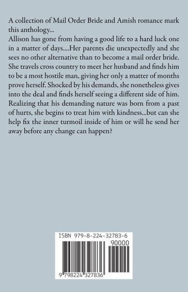 A collection of Mail Order Bride and Amish romance mark this anthology... Allison has gone from having a good life to a hard luck one in a matter of days....Her parents die unexpectedly and she sees no other alternative than to become a mail order bride. She travels cross country to meet her husband and finds him to be a most hostile man, giving her only a matter of months prove herself. Shocked by his demands, she nonetheless gives into the deal and finds herself seeing a different side of him. Realizing that his demanding nature was born from a past of hurts, she begins to treat him with kindness...but can she help fix the inner turmoil inside of him or will he send her away before any change can happen?