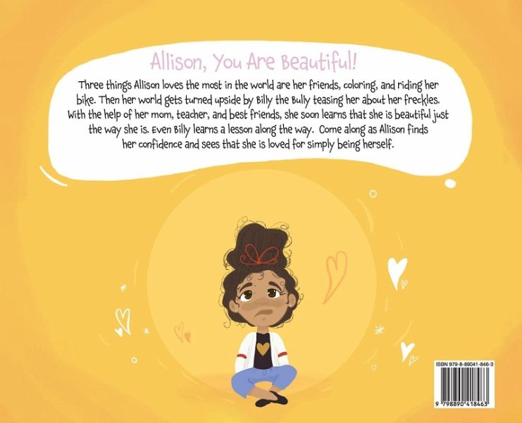 Allison, you are beautiful! Three things Allison loves the most in the world are her friends, coloring, and riding her bike. Then her world gets turned upside by Billy the Bully teasing her about her freckles. With the help of her mom, teacher, and best friends, she soon learns that she is beautiful just the way she is. Even Billy learns a lesson along the way. Come along as Allison finds her confidence and sees that she is loved for simply being herself.