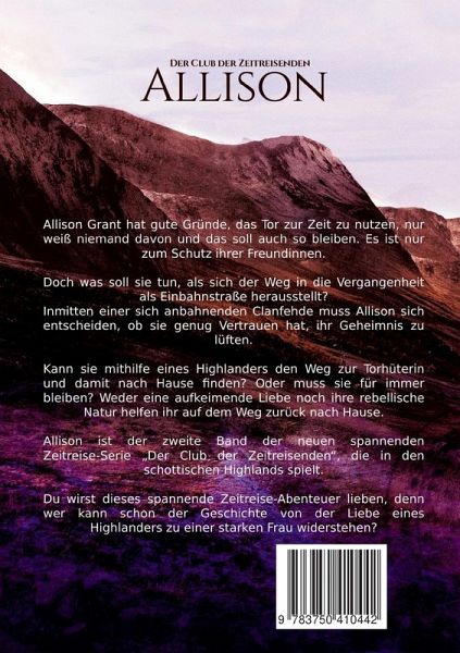 Allison Grant hat gute Gründe, das Tor zur Zeit zu nutzen, nur weiß niemand davon und das soll auch so bleiben. Es ist nur zum Schutz ihrer Freundinnen.Doch was soll sie tun, als sich der Weg in die Vergangenheit als Einbahnstraße herausstellt? Inmitten einer sich anbahnenden Clanfehde muss Allison sich entscheiden, ob sie genug Vertrauen hat, ihr Geheimnis zu lüften. Kann sie mithilfe eines Highlanders den Weg zur Torhüterin und damit nach Hause finden? Oder muss sie für immer bleiben? Weder eine aufkeimende Liebe noch ihre rebellische Natur helfen ihr auf dem Weg zurück nach Hause.Allison ist der zweite Band der spannenden Zeitreise-Serie Der Club der Zeitreisenden, die in den schottischen Highlands spielt. Du wirst dieses spannende Zeitreise-Abenteuer lieben, denn wer kann schon der Geschichte von der Liebe eines Highlanders zu einer starken Frau widerstehen?Alle Romane von Der Club der Zeitreisenden sind in sich abgeschlossen und in jedem Buch findet eine andere der Freundinnen, den Mann, für den sie bestimmt ist. Begleite die vier Freundinnen in eine Welt voller Abenteuer, Freundschaft, Liebe und natürlich atemberaubender Highlander im schottischen Hochland.