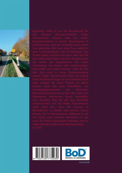 Eigentlich sollte es nur ein Routine-Job für den jungen Zeitungs-Volontär Heiko Timmermann werden, aber bei einem Brandexperiment in einem Steinzeitpark in Dithmarschen wird die verkohlte Leiche einer Frau gefunden. Wer war diese Frau, vielleicht eine Landstreicherin? Die Ermittlungen der Polizei laufen zunächst ins Leere, aber der Fall lässt Heiko keine Ruhe. Als dann ausgerechnet der Leiter des Experiments, ein Kieler Archäologe, bei einem sehr merkwürdigen Autounfall ums Leben kommt, steht für ihn fest: Hier muss es einen Zusammenhang geben. Heiko Timmermann stellt auf eigene Faust Nachforschungen an und entdeckt auch bald Indizien für seine Theorie. Es bleibt jedoch nicht bei zwei Todesfällen, ein Landtagsabgeordneter der dänischen Minderheitspartei wird auf der Fahrt über den Eiderdamm erschossen. Kaum vorstellbar, dass derselbe Täter für alle drei Todesfälle verantwortlich ist? Für Heiko Timmermann steht bald fest, dass die Lösung in Wesselburen zu finden sein könnte, einemkleinen Ort in Dithmarschen. Während er auf der Suche nach weiteren Hinweisen ist, die auch die Polizei überzeugen könnten, wird er selbst beinahe Opfer eines Mordanschlags.