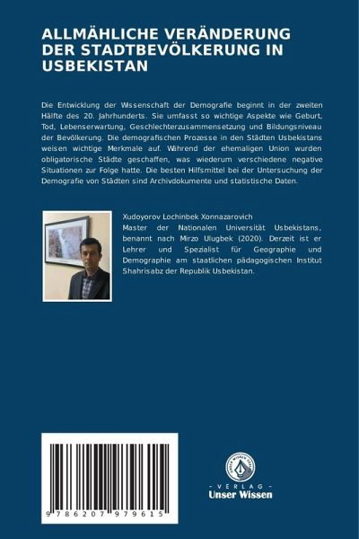 Die Entwicklung der Wissenschaft der Demografie beginnt in der zweiten Hälfte des 20. Jahrhunderts. Sie umfasst so wichtige Aspekte wie Geburt, Tod, Lebenserwartung, Geschlechterzusammensetzung und Bildungsniveau der Bevölkerung. Die demografischen Prozesse in den Städten Usbekistans weisen wichtige Merkmale auf. Während der ehemaligen Union wurden obligatorische Städte geschaffen, was wiederum verschiedene negative Situationen zur Folge hatte. Die besten Hilfsmittel bei der Untersuchung der Demografie von Städten sind Archivdokumente und statistische Daten.