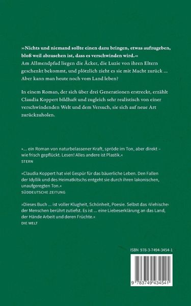"Nichts und niemand sollte einen dazu bringen, etwas aufzugeben, bloß weil abzusehen ist, dass es verschwinden wird."Am Allmendpfad liegen die Äcker, die Luzie von ihren Eltern geschenkt bekommt, und plötzlich zieht es sie mit Macht zurück ...Aber kann man heute noch vom Land leben?In einem Roman, der sich über drei Generationen erstreckt, erzählt Claudia Koppert bildhaft und zugleich sehr realistisch von einer verschwindenden Welt und dem Versuch, sie sich auf neue Art zurückzuholen. "... ein Roman von naturbelassener Kraft, spröde im Ton, aber direkt - wie frisch gepflückt. Lesen! Alles andere ist Plastik." STERN"Claudia Koppert hat viel Gespür für das bäuerliche Leben. Den Fallen der Idyllik und des Heimatkitschs entgeht sie durch ihren lakonischen, unaufgeregten Ton. SÜDDEUTSCHE ZEITUNG"Dieses Buch ... ist voller Klugheit, Schönheit, Poesie. Selbst das 'Viehische' der Menschen berührt zutiefst. Es ist ... eine Liebeserklärung an das Land, der Hände Arbeit und deren Früchte." DIE WELT