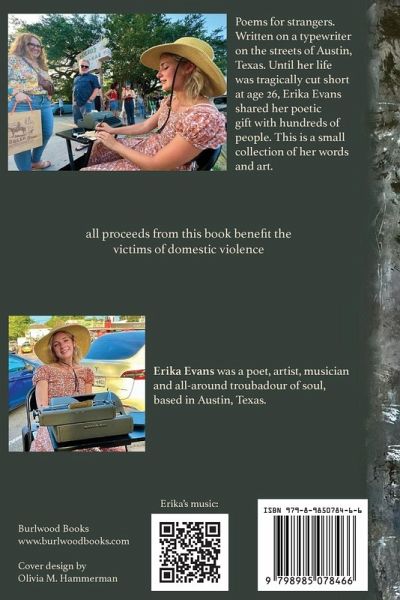 Poems for strangers. Written on a typewriter on the streets of Austin, Texas. Until her life was tragically cut short at age 26, Erika Evans shared her poetic gift with hundreds of people. This is a small collection of her words and art. . All proceeds from this book benefit the victims of domestic violence.