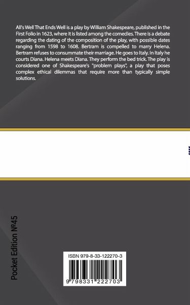 All's Well That Ends Well is a play by William Shakespeare, published in the First Folio in 1623, where it is listed among the comedies. There is a debate regarding the dating of the composition of the play, with possible dates ranging from 1598 to 1608. Bertram is compelled to marry Helena. Bertram refuses to consummate their marriage. He goes to Italy. In Italy he courts Diana. Helena meets Diana. They perform the bed trick. The play is considered one of Shakespeare's "problem plays", a play that poses complex ethical dilemmas that require more than typically simple solutions.