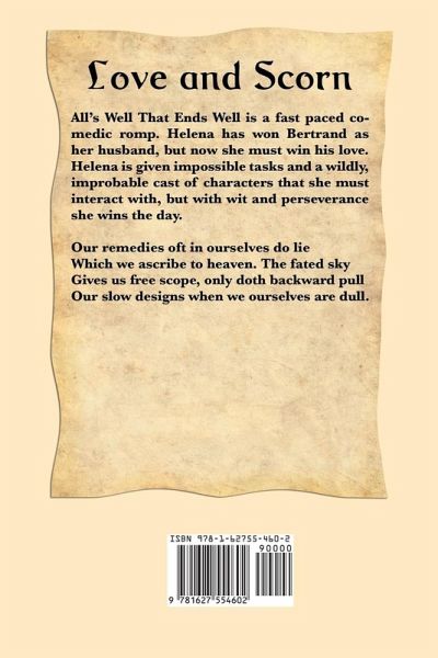 Love and Scorn-- All's Well That Ends Well is a fast paced comedic romp. Helena has won Bertrand as her husband, but now she must win his love. Helena is given impossible tasks and a wildly, improbable cast of characters that she must interact with, but with wit and perseverance she wins the day. Our remedies oft in ourselves do lie Which we ascribe to heaven. The fated sky Gives us free scope, only doth backward pull Our slow designs when we ourselves are dull.