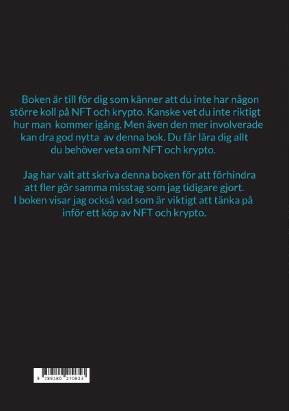 Boken är till för dig som känner att du inte har någon större koll på NFT och krypto. Kanske vet du inte riktigt hur man kommer igång. Men även den mer involverade kan dra god nytta av denna bok. Du får lära dig allt du behöver veta om NFT och krypto. Jag har valt att skriva denna boken för att förhindra att fler gör samma misstag som jag tidigare gjort. I boken visar jag också vad som är viktigt att tänka på inför ett köp av NFT och krypto.