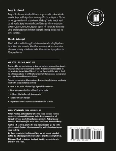 Allt om NVivo 10 är vår kompletta handbok för världens populäraste programvara för kvalitativ analys. Boken har två författare. Bengt Edhlund är lärare med mångårig erfarenhet av att undervisa och skriva om forskarens mest användbara programvaror. Allan McDougall har arbetat med NVivo 8, NVivo 9 och NVivo 10 som kvalitativ forskare och doktorand inom hälsovården. Vi har tillsammans skrivit denna bok med lättfattliga instruktioner och goda råd till både nybörjare och mera erfarna användare . Vi har sökt skapa funktionsblock av denna programvara som kan beskrivas steg för steg. Vi har också velat beskriva hur man använder NVivo 10 i samarbete i projektgrupp. Hoppas du som läsare kommer att ha nytta och nöje av denna bok. Du är välkommen att kontakta oss närhelst du känner behov därav på: info@formkunskap.com