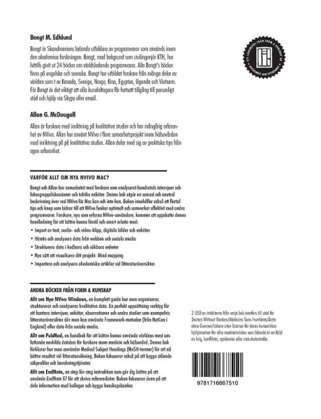 Allt om Nya NVivo Mac är vår kompletta handbok för världens populäraste programvara för kvalitativ analys. Boken har två författare. Bengt Edhlund är lärare med mångårig erfarenhet av att undervisa och skriva om forskarens mest användbara programvaror. Allan McDougall har arbetat med NVivo som kvalitativ forskare och doktorand inom hälsovården. Vi har tillsammans skrivit denna bok med lättfattliga instruktioner och goda råd till både nybörjare och mera erfarna användare. Vi har sökt skapa funktionsblock av denna programvara som kan beskrivas steg för steg. Hoppas du som läsare kommer att ha nytta och nöje av denna bok. Du är välkommen att kontakta oss närhelst du känner behov därav på: info@formkunskap.se