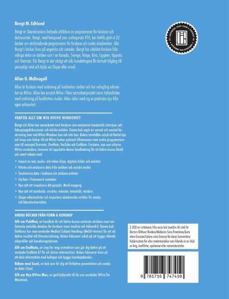Allt om Nya NVivo, 1:a upplagan, är vår kompletta handbok för världens populäraste programvara för kvalitativ analys. Boken har två författare. Bengt Edhlund är lärare med mångårig erfarenhet av att undervisa och skriva om forskarens mest användbara programvaror. Allan McDougall har arbetat med NVivo som kvalitativ forskare och doktorand inom hälsovården. Vi har tillsammans skrivit denna bok med lättfattliga instruktioner och goda råd till både nybörjare och mera erfarna användare. Vi har sökt skapa funktionsblock av denna programvara som kan beskrivas steg för steg. Vi har också velat beskriva hur man använder NVivo i samarbete i projektgrupp. Hoppas du som läsare kommer att ha nytta och nöje av denna bok. Du är välkommen att kontakta oss närhelst du känner behov därav på: info@formkunskap.com