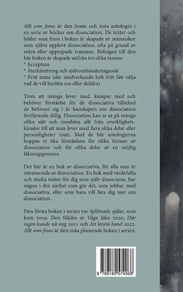 Allt som finns är den femte och sista antologin i en serie av böcker om dissociation. De texter och bilder som finns i boken är skapade av människor som själva upplevt dissociation, ofta på grund av svåra eller upprepade trauman. Bidragen till den här boken är skapade utifrån tre olika teman: * Acceptans * Återhämtning och självomhändertagande * Fritt tema (där medverkande helt fritt fått välja vad de vill berätta om eller skildra) Trots att många lever med, kämpar med och behöver förståelse för de dissociativa tillstånd de befinner sig i är kunskapen om dissociation fortfarande dålig. Dissociation kan se ut på många olika sätt och innebära allt från overklighetskänslor till att man lever med flera olika delar eller personligheter inuti. Med de här antologierna hoppas vi öka förståelsen för olika former av dissociation och för olika delar av en möjlig läkningsprocess. Det här är en bok av dissociativa, för alla som är intresserade av dissociation. En bok med värdefulla och starka texter för dig som själv dissocierar, har någon i din närhet som gör det, som jobbar med dissociativa, eller som bara vill lära dig mer om dissociation. Den första boken i serien var Splittrade själar, som kom 2019. Den följdes av Våga läka 2020, Där ingen kunde nå mig 2021 och Att knyta band 2022. Allt som finns är den sista planerade boken i serien. Böckerna ges ut av föreningen Om dissociation.