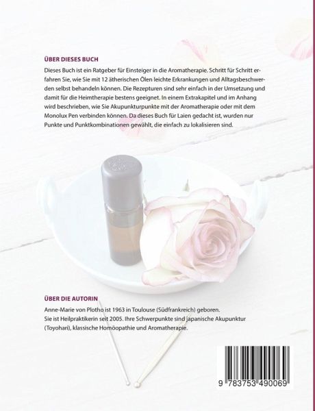 Dieses Buch ist ein Ratgeber für Einsteiger in die Aromatherapie. Schritt für Schritt erfahren Sie, wie Sie mit 12 ätherischen Ölen leichte Erkrankungen und Alltagsbeschwerden selbst behandeln können. Die Rezepturen sind sehr einfach in der Umsetzung unddamit für die Heimtherapie bestens geeignet. In einem Extrakapitel und im Anhang wird beschrieben, wie Sie Akupunkturpunkte mit der Aromatherapie oder mit dem Monolux Pen verbinden können. Da dieses Buch für Laien gedacht ist, wurden nur Punkte und Punktkombinationen gewählt, die einfach zu lokalisieren sind.