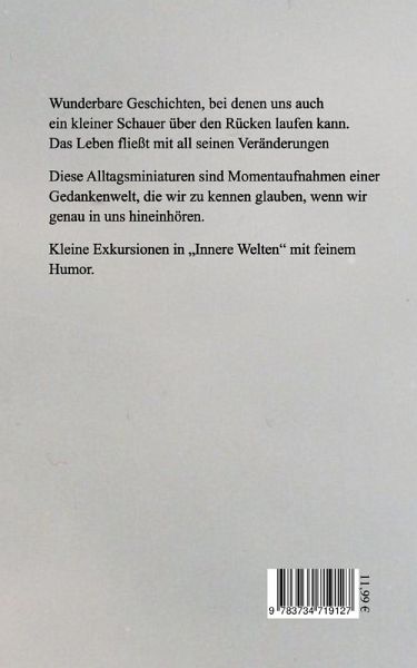 Wunderbare Geschichten, bei denen uns auch ein kleiner Schauer über den Rücken laufen kann. Das Leben fließt mit all seinen Veränderungen.Diese Alltagsminiaturen sind Momentaufnahmen einer Gedankenwelt, die wir zu kennen glauben, wenn wir genau in uns hineinhören. Kleine Exkursionen in Innere Welten mit feinem Humor.