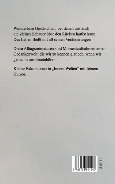 Wunderbare Geschichten, bei denen uns auch ein kleiner Schauer über den Rücken laufen kann. Das Leben fließt mit all seinen Veränderungen Diese Alltagsminiaturen sind Momentaufnahmen einer Gedankenwelt, die wir zu kennen glauben, wenn wir genau in uns hineinhören. Kleine Exkursionen in Innere Welten mit feinem Humor.